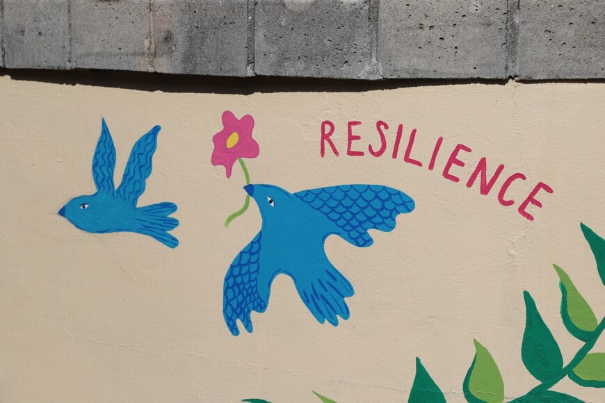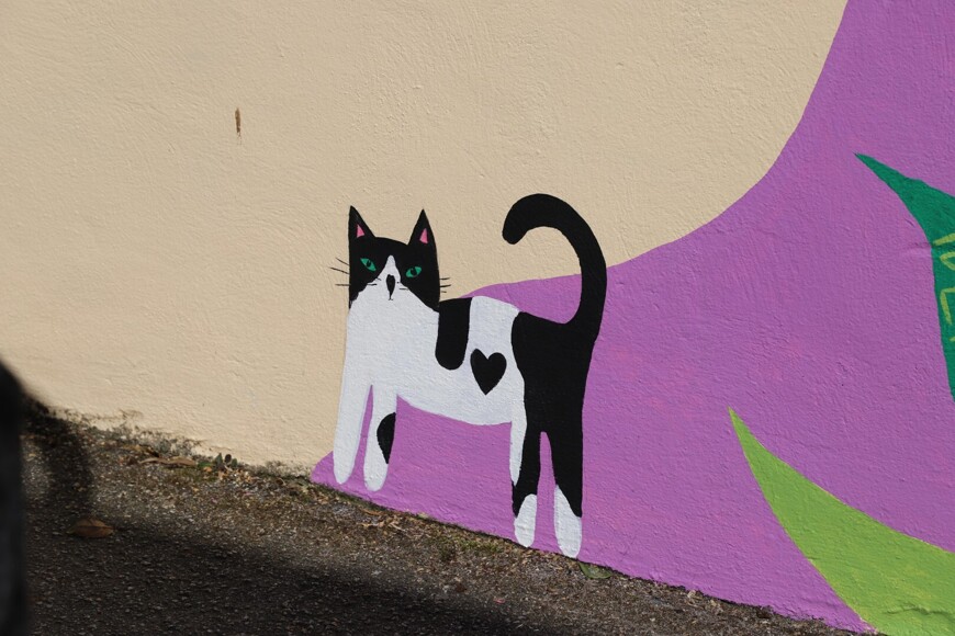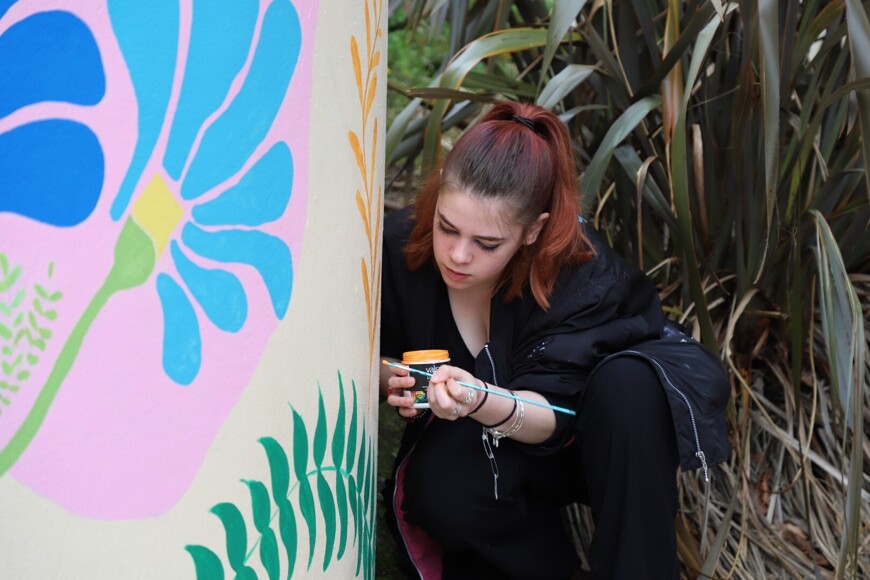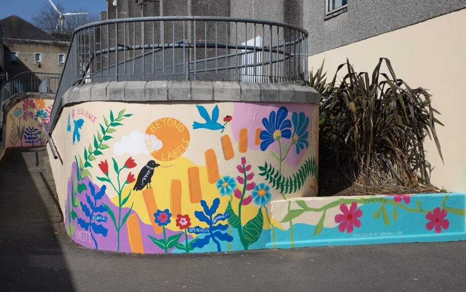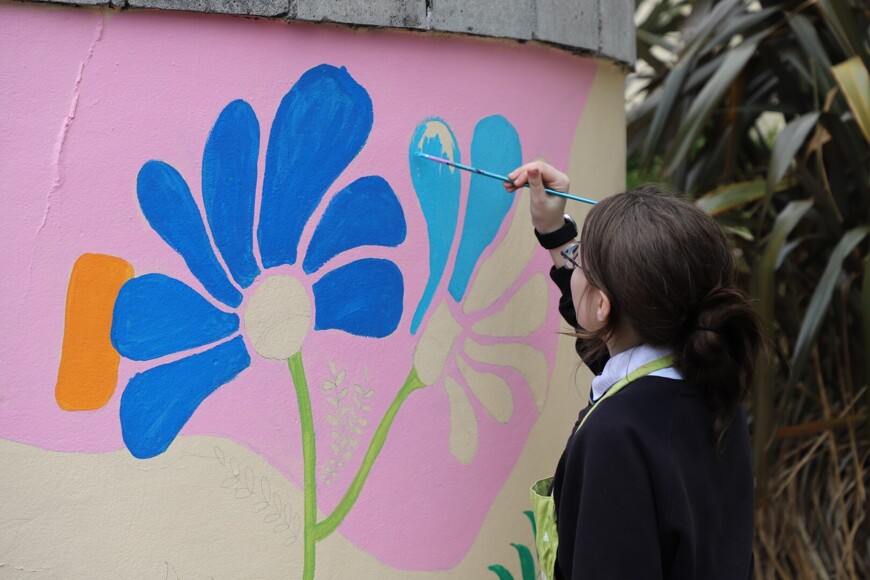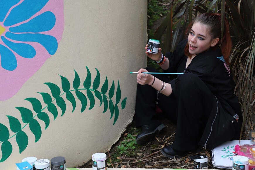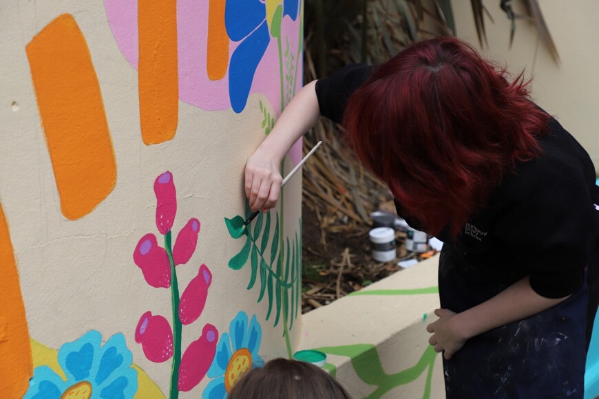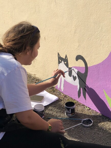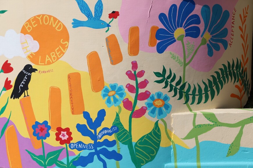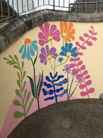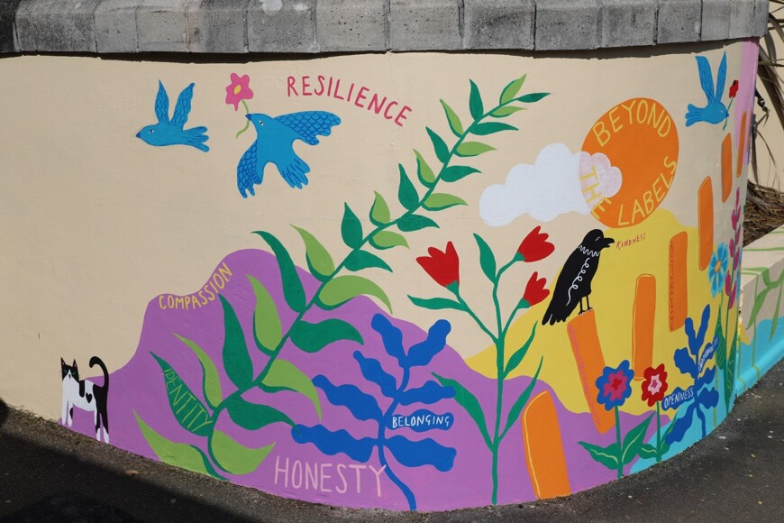 The ‘Beyond The Labels’ group decided that they wanted to do something to share the values of their group with the wider community. The result is a beautiful mural that they designed and painted on our school grounds. The artwork is a stunning display of colour and natural shapes. Filled with words that are of great importance to us as a school, as well as a special someone who we hold very dear to our hearts. Our very own resident cat, Minstrel (who is still happily enjoying his retirement), has earned his place on the beautiful wall for all to see. It has been so lovely hearing all the comments of admiration and support as other students and staff move about the school throughout the day. The weather has certainly been on our side, with beautiful sunshine beaming down on our team as they transformed this blank canvas into their vision.
