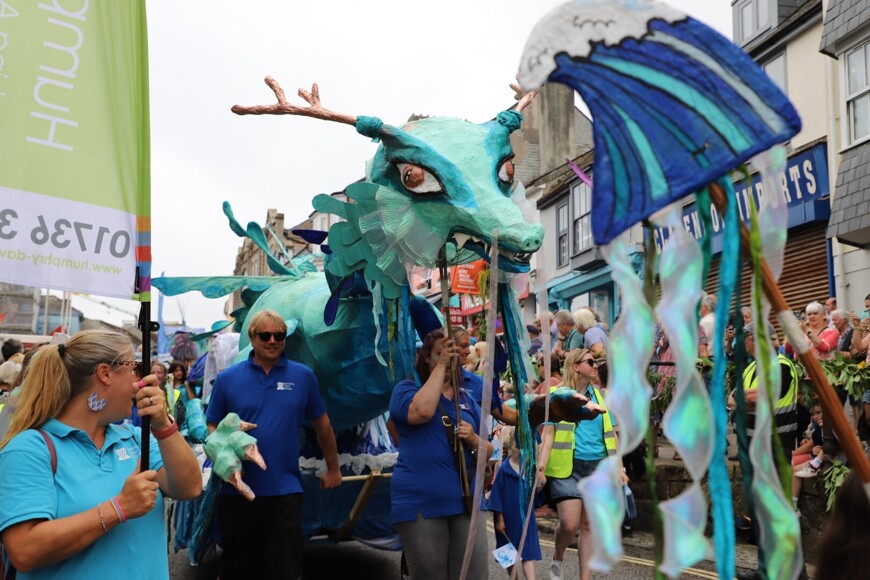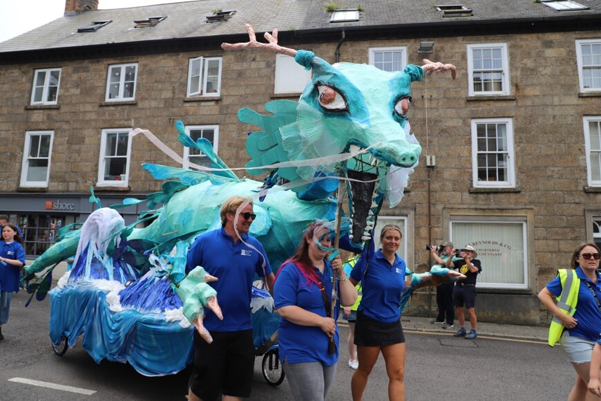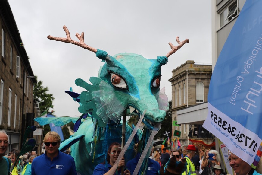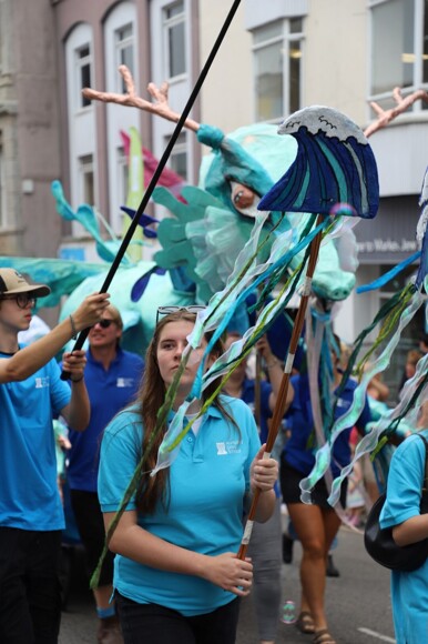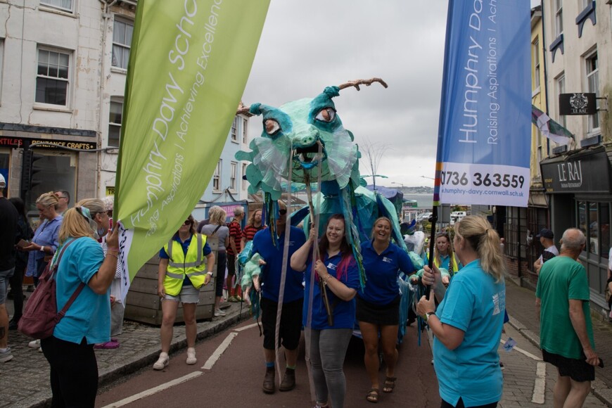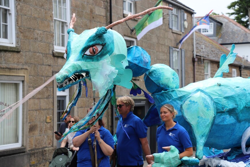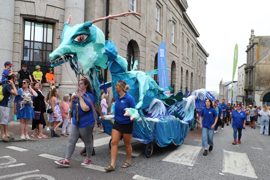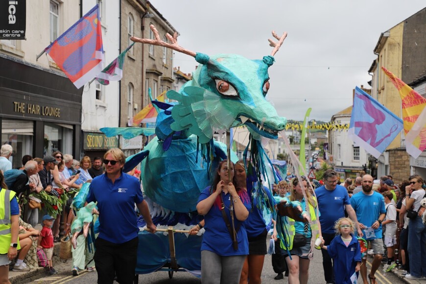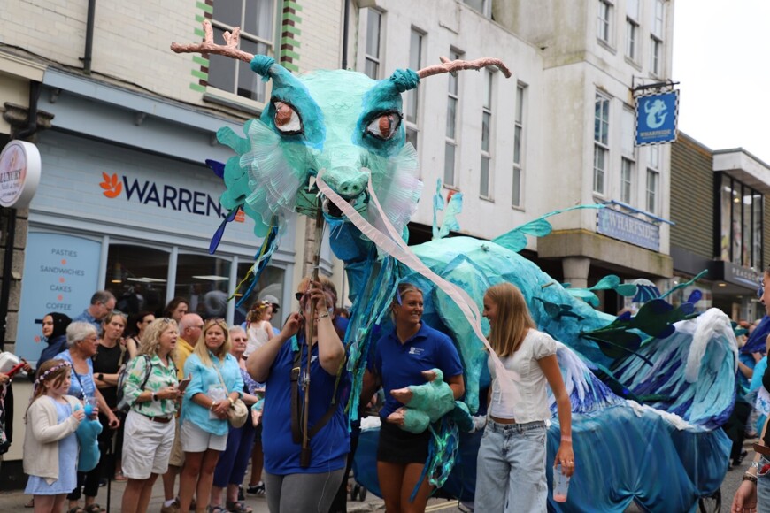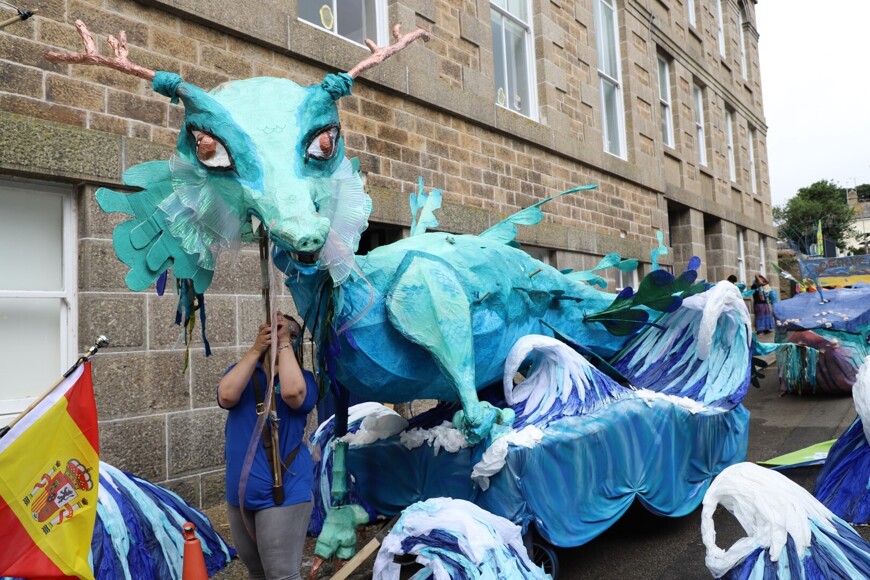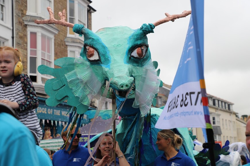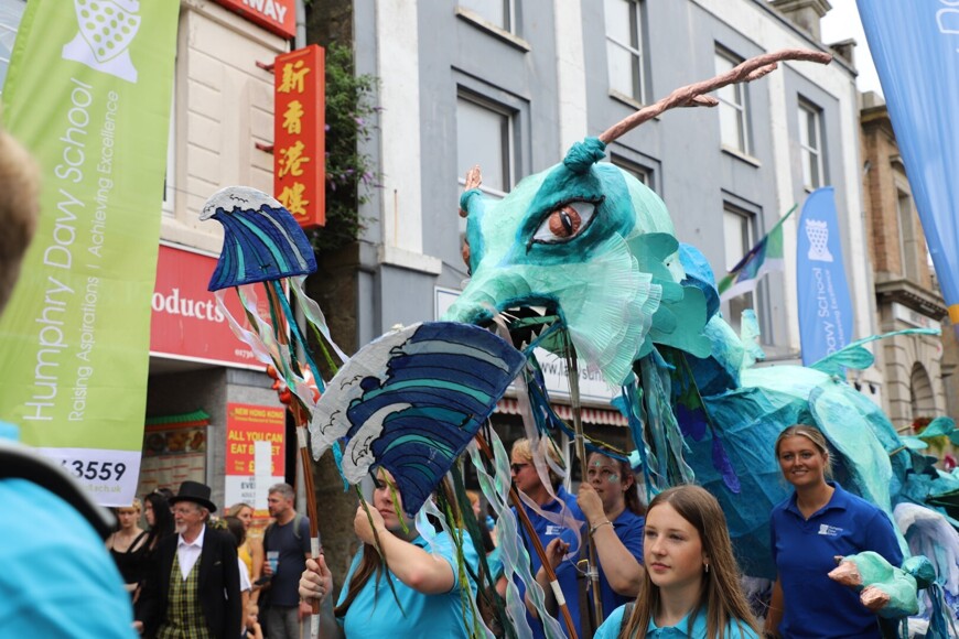 Our stunning contribution to the Golowan Festival parade was a spectacular Sea Dragon, lovingly created by students and staff. Towering above the crowds and shimmering in the summer sun, our dragon was a real show-stopper and one of the largest pieces in the procession – it certainly turned heads as it made its way through the town.